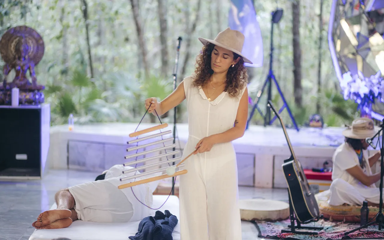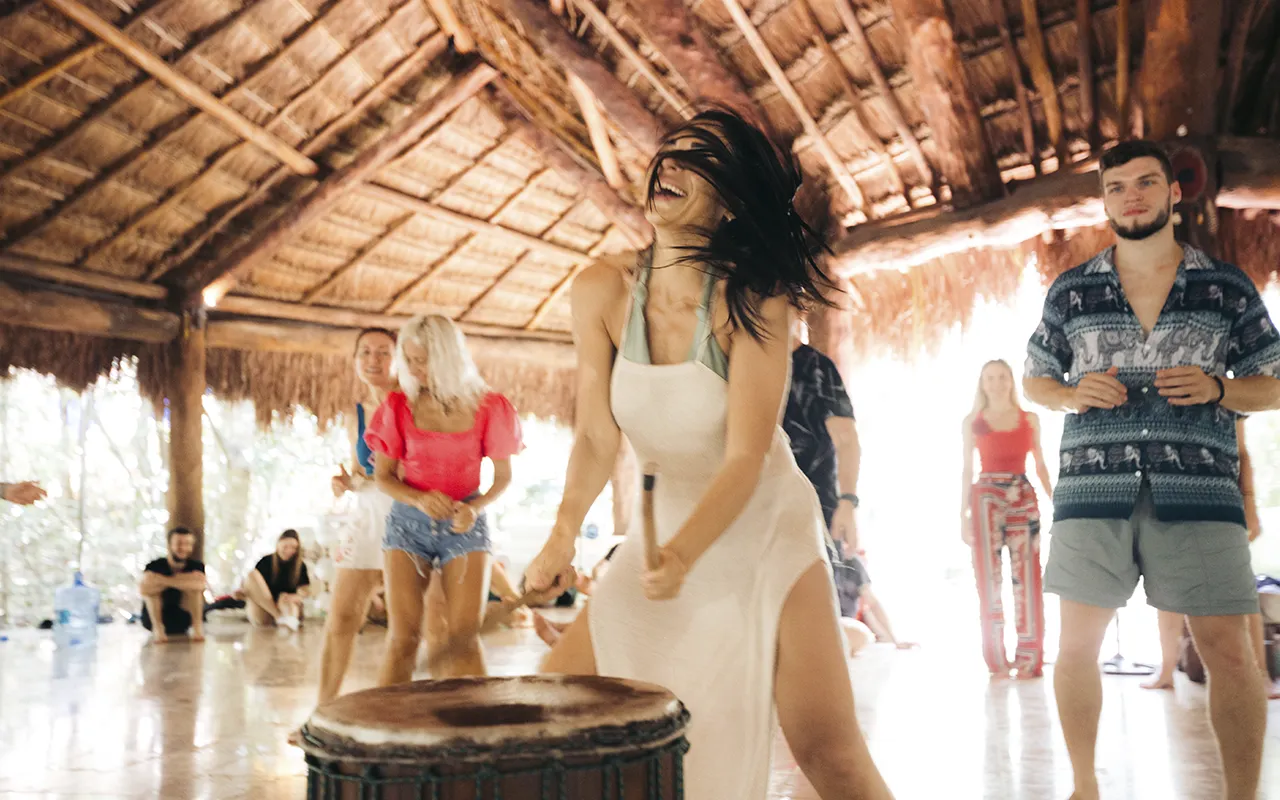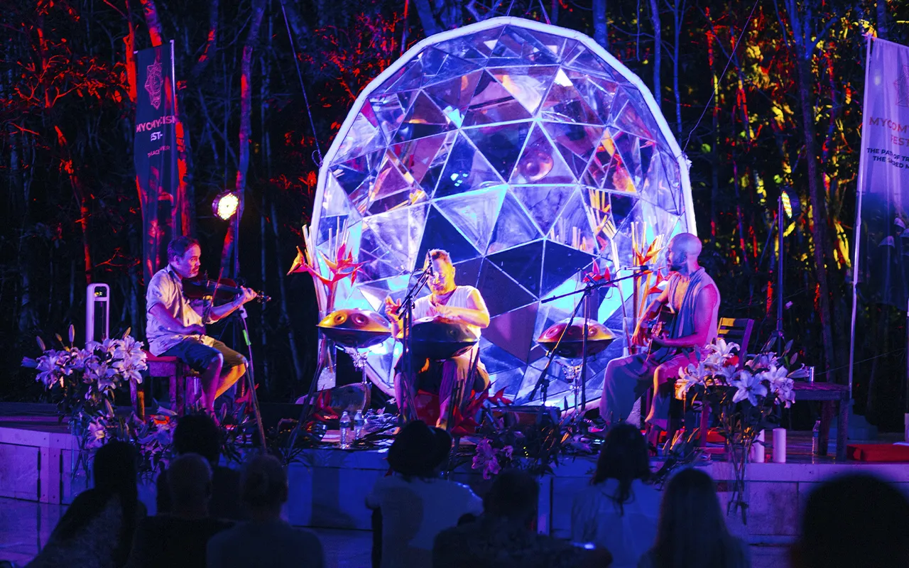 A Mycomysticism Festival is a multi-day group retreat combining sacred psilocybin ceremonies, wellness practices, live music, and community, held at a private resort in Mexico.